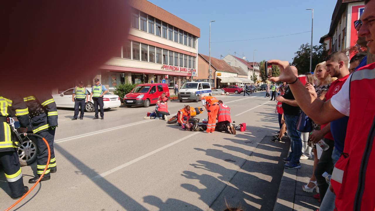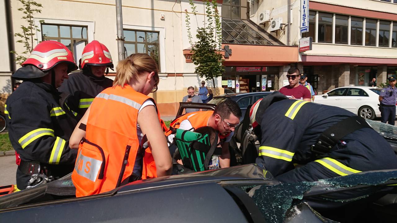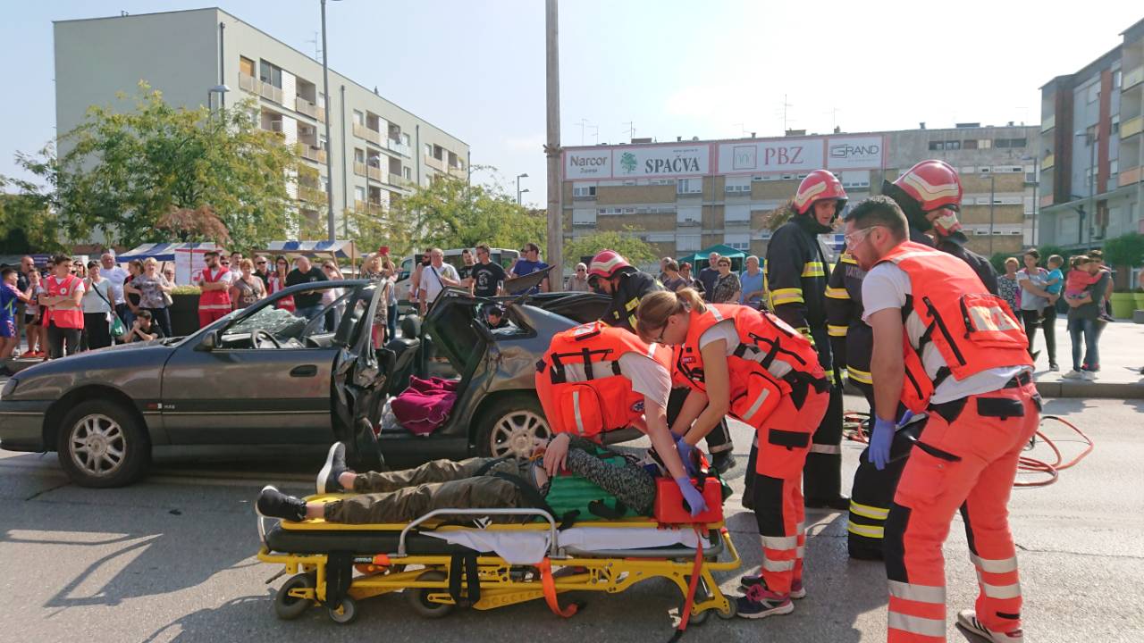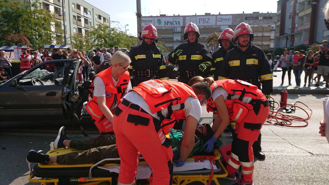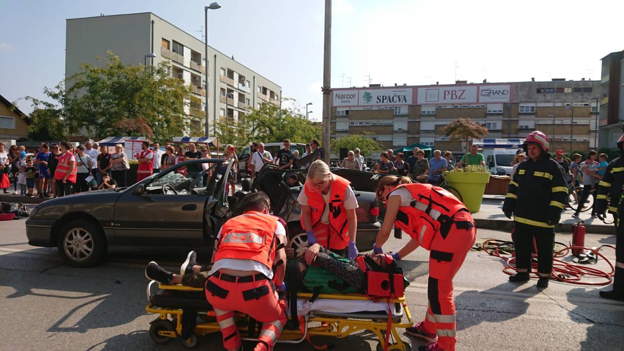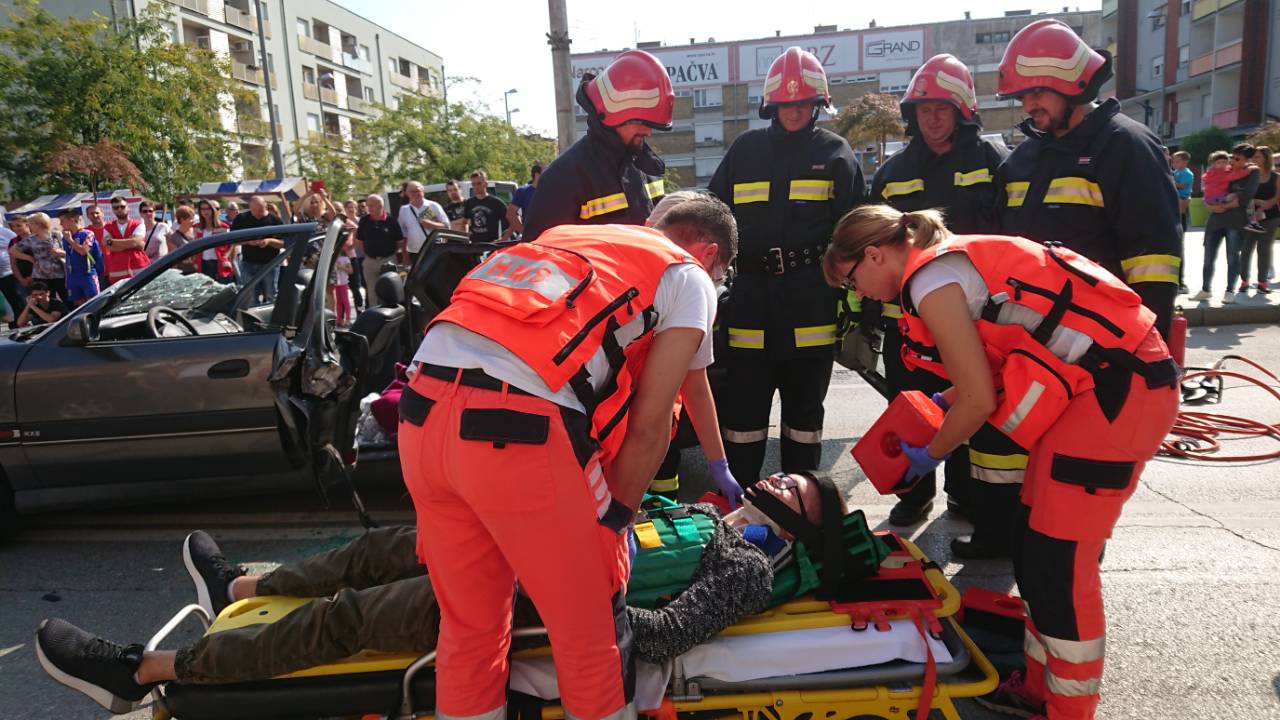 Građanima Županje prikazano je zbrinjavanje više ozlijeđenih osoba u prometnoj nesreći sa različitim vrstama ozljeda koristeći stvarnu opremu i postupke koji se primjenjuju u izvanbolničkoj hitnoj medicinskoj službi.