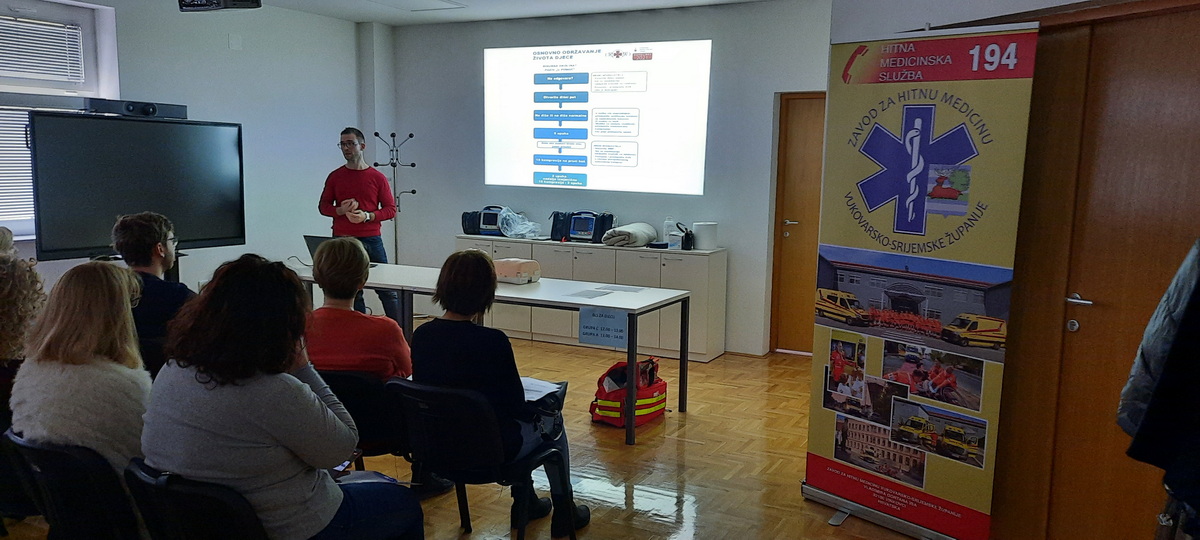 Organizatori tečaja bili su Hrvatsko društvo za hitnu medicinu i Zavod za hitnu medicinu Vukovarsko-srijemske županije. Predavači su bili liječnici i medicinski tehničari Zavoda. Dr. Dario Vukelić, specijalist hitne medicine, predstavio je recentne smjernice u liječenju anafilaksije. Dr. sc. Jelena Kovačević, specijalist školske medicine i nacionalni instruktor za BLS i AVD, držala je predavanje o kardiopulmonalnoj reanimaciji. Dr. Tea Majer predstavila je osnovne mjere održavanja života odraslih, a dr. Ivan Školka predstavio je osnovne mjere održavanja života djece.